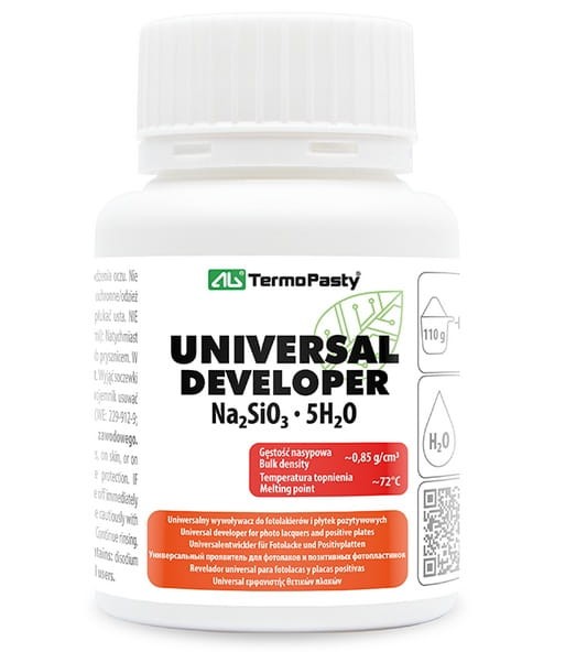 Aby przygotować roztwór wywoływacza, odważ 110 g produktu i rozpuść go w 2 litrach (±0,5 L) wody o temperaturze około 50°C, mieszając aż do całkowitego rozpuszczenia. Następnie pozostaw roztwór do ostygnięcia do temperatury pokojowej, aby był gotowy do użycia. Proces wywoływania polega na zanurzeniu płytki pozytywowej lub elementu pokrytego fotolakierem w przygotowanym roztworze na czas od 30 do 60 sekund. Nie przekraczaj 2 minut, aby uniknąć uszkodzenia konturów. W razie potrzeby wykonaj próby i skoryguj stężenie.