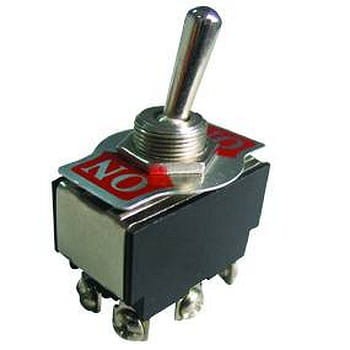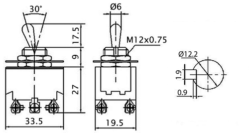 Przełącznik hebelkowy, dwusekcyjny ON-OFF-(ON) 6A/250VAC. - 1 pozycja krańcowa niestabilna, przełączne; - dźwignia metalowa; - wyprowadzenia śrubowe; - dwie sekcje, 6 wyprowadzeń; - wymiary korpusu bez wyprowadzeń, dźwigni i tulei LxBxH: 33.5x19x19.5mm; - długość dźwigni: 17.5 mm; - mocowane M12; - styki: 6A/250VAC.