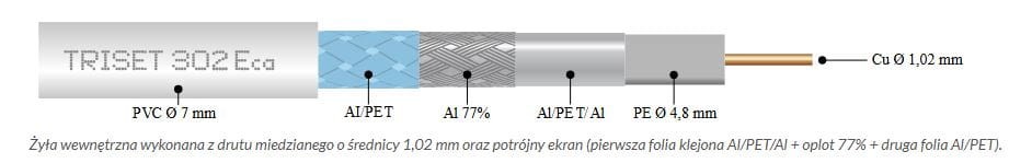 Kabel sprzedawany na na metry bieżące. Wysokiej jakości, potrójnie ekranowany kabel koncentryczny typu RG6 posiada żyłę wewnętrzną wykonaną z drutu miedzianego o średnicy 1,02 mm, co sprawia, że kabel posiada bardzo dobre parametry tłumiennościowe. Rdzeń ten nie ulega korozji, a przewód nie jest sztywny.