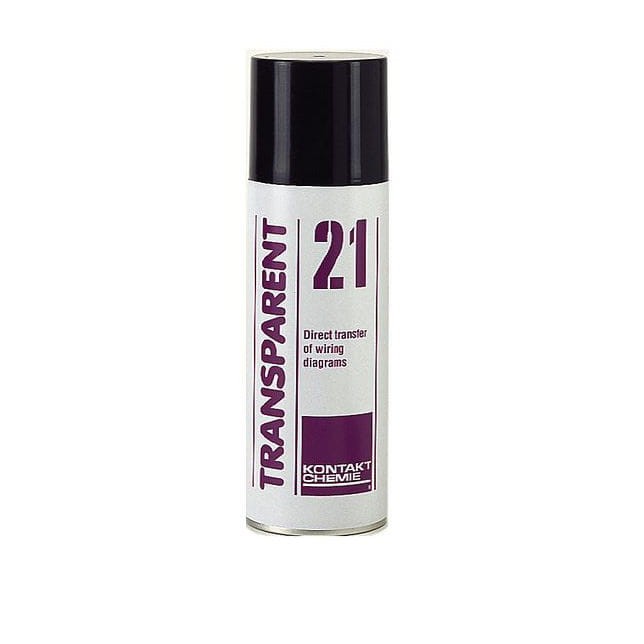 TRANSPARENT 21 Jest to preparat, który służy do bezpośredniego przenoszenia na powierzchnie laminatu rysunków schematów elektronicznych w skali 1:1. Jednostronnie zadrukowane strony czasopism po natryśnięciu preparatem stają się przeźroczyste i przepuszczalne dla światła ultrafioletowego co umożliwia bezpośrednie przenoszenie schematów np. z czasopism na powierzchnie pokryte lakierem światłoczułym POSITIV 20. Nie trzeba wówczas tracić czasu na pracochłonna reprodukcję.