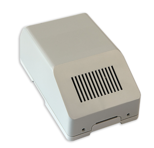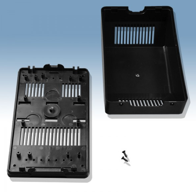 Obudowa z tworzywa zasilacza, posiada otwory wentylacyjne. Składa się z dwóch części. Łączenie dolnej i górnej części odbywa się przy pomocy dwóch wkrętów. Spód obudowy przystosowany do nasunięcia na szynę.