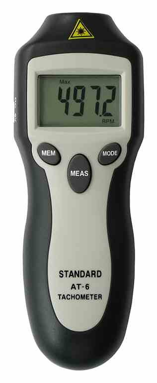 W konstrukcji tachometru AT-6 zastosowano technikę mikroprocesorową, fotoelektryczną i laserową. Przyrząd emituje wiązkę laserową, która po przejściu przez jego układ optyczny pada na obracający się obiekt, którego prędkość obrotową ma się mierzyć. Na obiekt nakleja się wcześniej taśmę samoprzylepną odbijającą światło z naniesionym paskami, ściślej wycięty z niej kwadrat o boku 12 mm. Jeśli właściowości ruchomego obiektu sprawiają, że odbija on światło, należy wcześniej pokryć go czarną taśmą farbą. Przyrząd wyposażono w funkcję monitora, która zaświeca wskaźnik w momencie, gdy światło laserowe pada na ruchomy obiekt (ściślej na kwadrat wycięty z taśmy refleksyjnej), przy czym odległość przyrządu od badanego obiektu powinna mieścić się w zakresie od 50 do 500 mm. Tachometr AT-6 mierzy zdalnie prędkość obrotową w zakresie od 1 do 99999 obr./min z rozdzielczością wskazania równą 0,1 obr./min (w zakresie od 2 do 999,9 obr./min) i 1 obr./min (powyżej 1000 obr./min). Dokładność pomiaru wynosi ±(0,05 proc. wartości wskazywanej + 1 cyfra). W razie potrzeby, użytkownik może przełączyć przyrząd na funkcję zliczania impulsów (“REV”). Korzystając z wbudowanej pamięci, można też (naciskając kolejno przycisk “MODE”) uzyskać wskazanie wartości maksymalnej, minimalnej i bieżącej pochodzącej z serii wyników pomiarów liczby obrotów uzyskanych od momentu włączenia zasilania przyrządu. Wyświetlacz ciekłokrystaliczny tachometru ma długość pięciu cyfr i podświetlenie. Czas próbkowania wynosi 0,5s przy prędkości obrotowej większej od 120 obr./min. Tachometr jest zasilany z jednej baterii 9V (6F22) lub z zewnętrznego zasilacza sieciowego o napięciu wyjściowym stałym 6 V, który przyłącza się do gniazda umieszczonego w obudowie przyrządu. Pobór prądu ze źródła zasilania nie przekracza 45 mA. Zadaniem funkcji automatycznego wyłączania zasilania jest przedłużenie czasu “życia” baterii. Funkcja ta odłącza zasilanie już po 10s braku aktywności operatora (brak naciśnięcia jakiegokolwiek przycisku). Ergonomiczna i specjalnie wyprofilowana obudowa tachometru (160x58x39 mm) z gumową osłoną wzmacnia go mechanicznie i zwiększa komfort obsługi (przyrząd wygodnie trzyma się w ręku i trudniej go z niej wypuścić). Masa tachometru wynosi 151 g. W wyposażeniu fabrycznym miernika jest futerał i bateria.