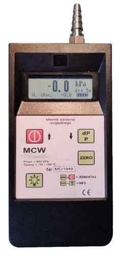 Miernik ciśnienia MCW100 jest elektronicznym urządzeniem pomiarowymi, służącym do pomiaru ciśnienia względnego powietrza lub gazów nieagresywnych. Może być stosowany w warunkach laboratoryjnych lub przemysłowych. Jego małe wymiary, niska masa, bateryjne zasilanie, odporność na wstrząsy oraz dowolna pozycja pracy czynią szczególnie przydatnym do prac terenowych. Mierniki ciśnienia względnego służą do pomiaru zmian ciśnienia względem bieżącej wartości ciśnienia atmosferycznego. Podłączenie punktów pomiarowych do miernika realizowane może być przewodami elastycznymi o średnicy wewnętrznej 5 ÷ 8 mm. Miernik ciśnienia MCW200 jest zasilany z wewnętrznej baterii 9V zapewniającej odpowiednio długi czas pracy przyrządu. Miernik MCW200 może być opcjonalnie wyposażony w skórzany pokrowiec.