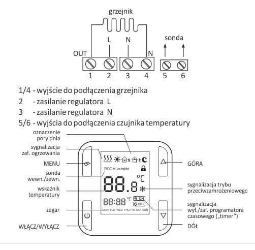 - 2 czujniki temperatury: wewnętrzny i zewnętrzny