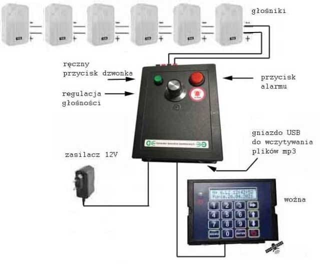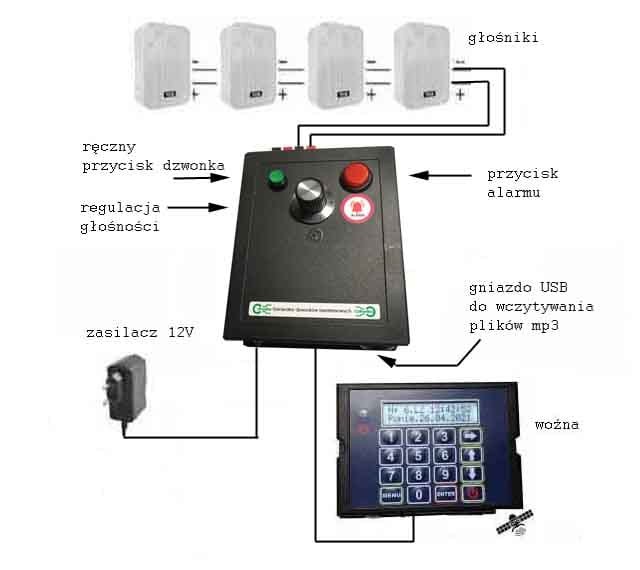 Instalacja: w miejsce istniejących dzwonków zasilanych z 230V instalujemy głośnik z naszej oferty i wykorzystujemy istniejące przewody ale po odłączeniu zasilania 230V!!!. Obwód głośników podłączamy do zacisków wyjścia generatora. Generator łączymy z woźną tak jak na pokazanym schemacie. I pozostaje tylko przygotować i wczytać melodię z komputera przy pomocy kabla USB. Generator dostarczamy z przykładowymi plikami dzwonka i alarmu. Szkoła jest instytucją publiczną, zatem przy wykorzystywaniu plików muzycznych należy się upewnić, że wybrany plik nie podlega ochronie praw autorskich. Na drugim zdjęciu pokazujemy schemat połączenia.