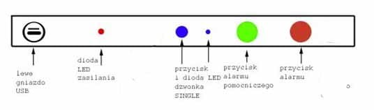 - po lewej stronie od przycisków alarmu jest mniejszy niebieski przycisk do ręcznego włączania dzwonka