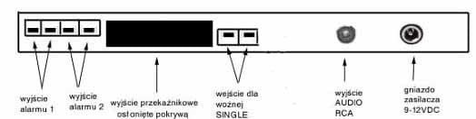 - Na tylnym panelu znajdują się zaciski przewodów prowadzących do woźnej, gniazdo zasilania i zaciski do wyprowadzenia alarmów na zewnątrz.