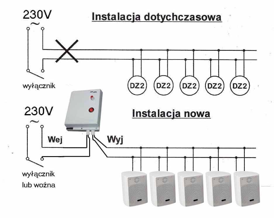 Instalacja: w miejsce istniejących dzwonków instalujemy głośniki z naszej oferty i wykorzystujemy istniejące przewody do połączenia głośników z generatorem. Do generatora podpinamy woźną (programowany sterownik dzwonków). I pozostaje tylko wczytać z pendrive nagraną wcześniej melodię. Na drugim zdjęciu pokazujemy schemat połączenia