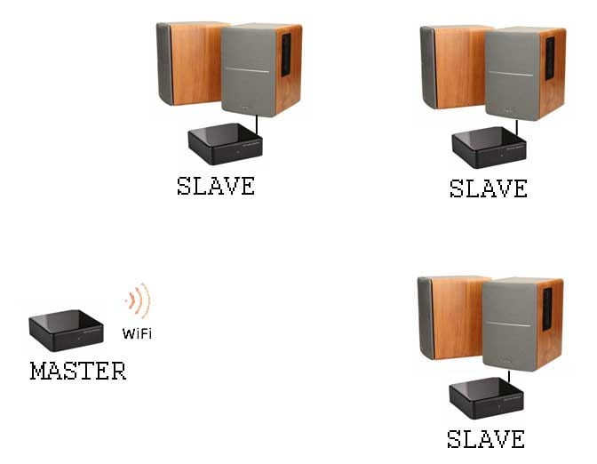 Zestaw przeznaczony do trzech pomieszczeń z głośnikami aktywnymi stereo. Propagacja i synchronizacja przez sieć Wi-Fi. W każdym pomieszczeniu musi być ta sama sieć. W przypadku gdy jest za słaba należy użyć wzmacniaczy (retransmiterów). Konfiguracja jest stabilna i odporna na zanik zasilania. Po włączeniu zasilania sama "wstaje".