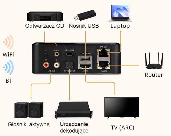 CL-BOX Pro to innowacyjny odbiornik audio do strumieniowego przesyłania muzyki przez WiFi, który pozwala przekształcić aktywne głośniki, soundbary i głośniki kina domowego w bezprzewodowy system streamingu muzyki. Obsługuje LAN, bezprzewodowe połączenie WiFi i Bluetooth. Posiada wejście TV ARC, USB, AUX, wyjście optyczne, liniowe analogowe stereo. Obsługuje protokoły Airplay i DLNA. Zaprojektowano go z myślą o mobilności i niewielkich rozmiarach, zajmując niewiele miejsca. Oferuje najłatwiejsze i najbardziej przyjazne dla użytkownika rozwiązanie do strumieniowego przesyłania muzyki. Możesz cieszyć się wysokiej jakości, bezstratnym strumieniowaniem muzyki bezprzewodowo w wielu pomieszczeniach.