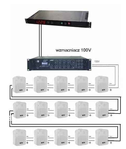 W zestawie przykładowo uwzględniono 32 głośniki o mocy 10W. Przy zastosowaniu mocniejszego wzmacniacza ilość głośników można znacznie powiększyć lub zamówić głośniki o większej mocy - choć na podstawie dotychczasowych realizacji głośniki o mocy 10W się sprawdzają.