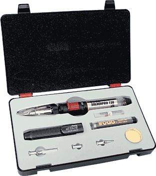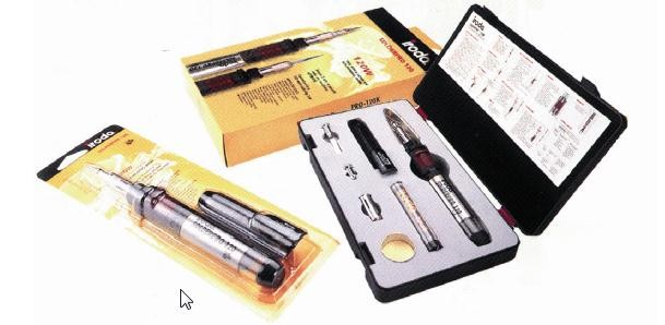 UM135.31: Zestaw IRODA-120. W zestawie lutownica gazowa i różne końcówki do lutowania (groty). Moc regulowana do 120W; temperatura palnika do 1300 stopni C; temperatura grota od 250 do 500 stopni C; zbiornik gazu 38 ml (4 godziny pracy); zapłon piezo.