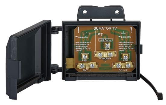 - Umożliwia podłączenie dwóch anten nawet z jednego pasma do jednego odbiornika TV lub może służyć jako rozgałęźnik antenowy i w tym przypadku umożliwia podłączenie do jednej anteny 2 odbiorników TV.