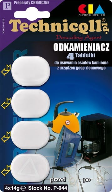 Roztwór do czyszczenia urządzeń gospodarstwa domowego przygotowuje się poprzez rozpuszczenie jednej kostki (14g) odkamieniacza w ok. jednej szklance (200ml) gorącej wody (ok. 60°C).Ilość roztworu musi zakrywać powierzchnie odkamienianią.