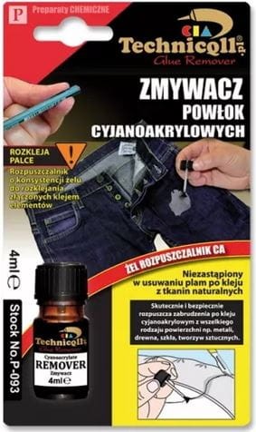 - Zastosowanie: usuwanie zabrudzeń po klejach błyskawicznych z powierzchni takich jak: bawełna, plastik, drewno, metale, jeans