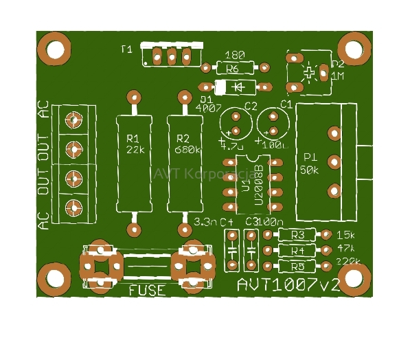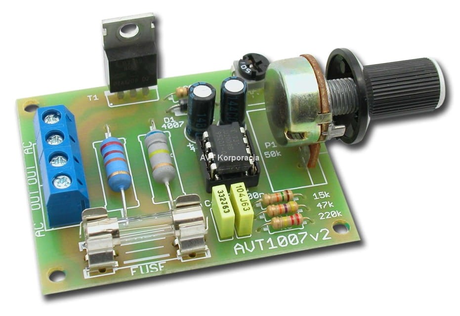 Wysokiej klasy sterownik prędkości obrotowej do jednofazowych komutatorowych silników elektrycznych. Zestaw AVT1007 wykonano w oparciu o specjalizowany układ scalony U2008. Układ ten ma wbudowany moduł zapewniający miękki start sterowanego silnika, blok nadzoru poboru prądu przez obciążenie (detekcja przeciążeń) oraz prosty stabilizator obrotów silnika, który wykrywa zmiany napięcia sieciowego i odpowiednio do tych zmian zwiększa lub zmniejsza kąt otwarcia triaka, regulując moc dostarczaną do obciążenia. Oprócz tego w strukturze układu zintegrowany został stabilizator napięcia zasilającego, precyzyjny komparator oraz źródło napięcia odniesienia. Płynną regulacją obrotów steruje potencjometr obrotowy.
