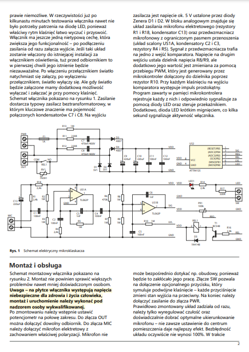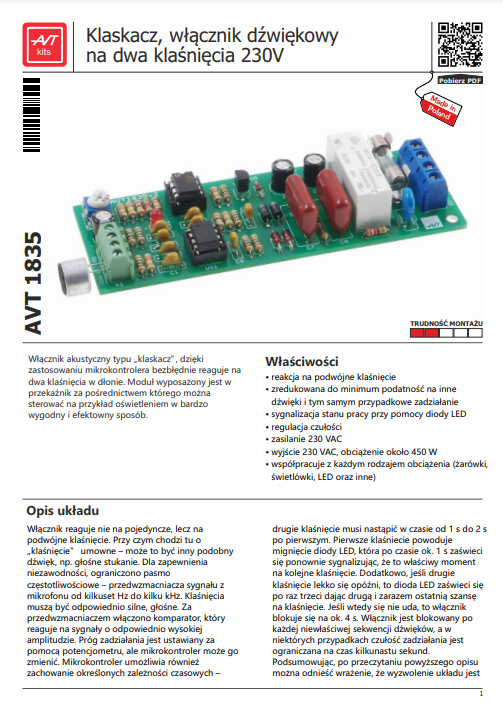 Włącznik akustyczny typu „klaskacz”, dzięki zastosowaniu mikrokontrolera bezbłędnie reaguje na dwa klaśnięcia w dłonie. Moduł wyposażony jest w przekaźnik za pośrednictwem którego można sterować na przykład oświetleniem w bardzo wygodny i efektowny sposób.