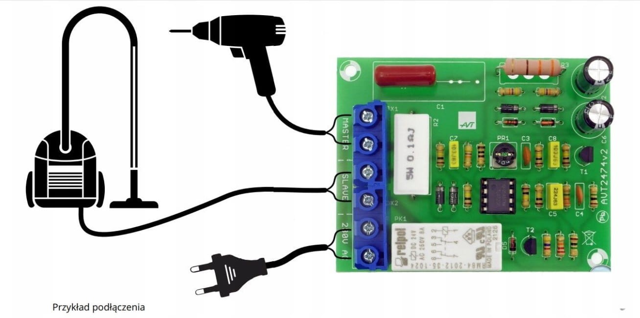 Układ pełni bardzo pożyteczne funkcje i rozwiązuje problem, przed którym staje wielu użytkowników sprzętu elektrycznego i elektronicznego. Jednym z nich jest sytuacja gdy wyłączenie urządzenia głównego nie wyłącza urządzenia pomocniczego. Przykładem może być zestaw wiertarka - odkurzacz. Dzięki prezentowanemu modułowi włączenie wiertarki automatycznie uruchomi odkurzacz, a po jej wyłączeniu, z niewielkim opóźnieniem czasowym zostanie on wyłączony.