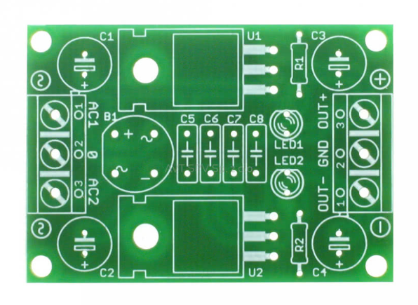 Proponowany układ jest prostym zasilaczem napięć symetrycznych o stałym, nieregulowanym napięciu wyjściowym 15V.