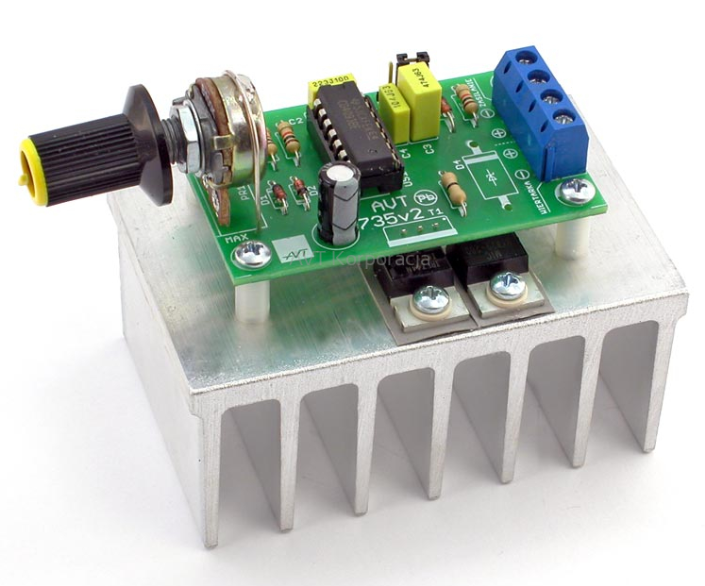 Prosty i niezawodny regulator włączany miedzy źródło zasilania a odbiornik. Zasilanie może pochodzić z akumulatora lub zasilacza sieciowego o odpowiedniej wydajności prądowej. Obciążeniem może być dowolny silnik prądu stałego lub żarówka.
