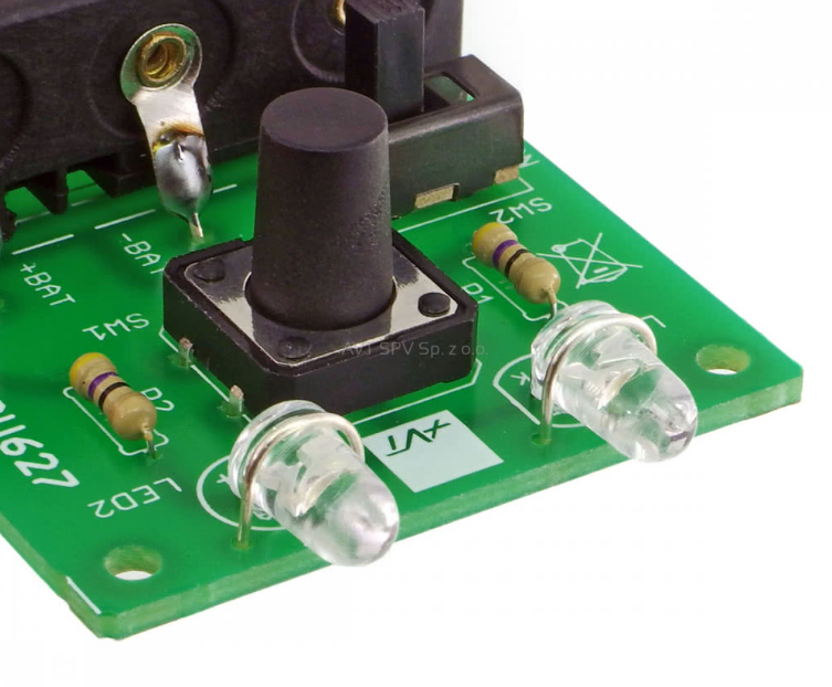 Zestaw elementów do budowy prostej latarki z dwiema diodami LED. Zestaw oprócz podstawowej funkcjonalności latarki będzie pomocny w nauce lutowania. Całość zasilana jest z 3 baterii AAA (R03). Zastosowanie przycisku i włącznika pozwala na uruchamianie latarki chwilowo lub na stałe. Płytka obwodu drukowanego ma wymiary 40 x 83 mm dzięki czemu całość jest mała i dobrze leży w dłoni.