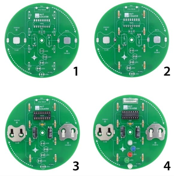 - Nauka lutowania w praktyce: Zestaw został zaprojektowany z myślą o początkujących. Przejrzysta płytka PCB o średnicy 90 mm pozwala na swobodne ćwiczenie techniki lutowania elementów przewlekanych.