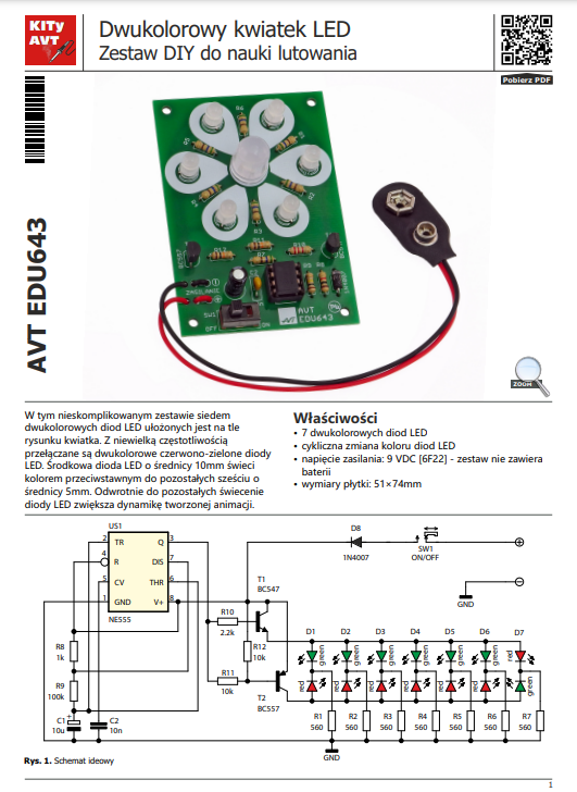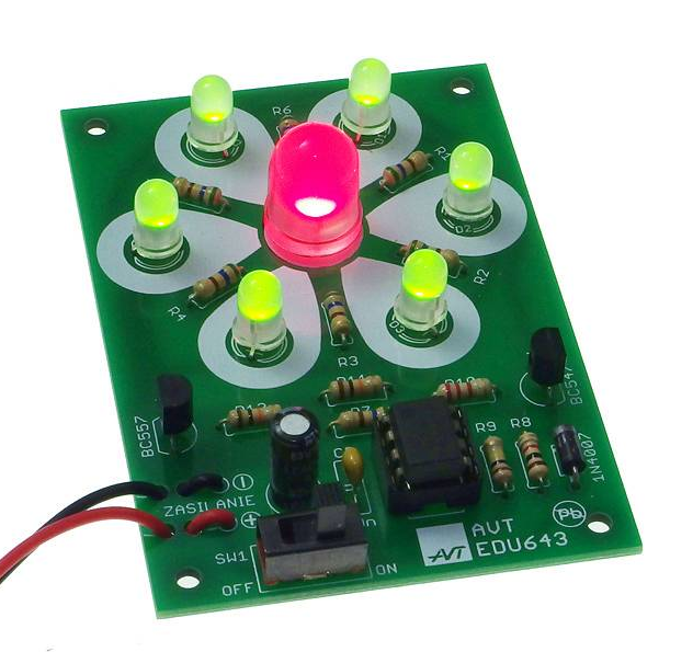 W tym nieskomplikowanym zestawie siedem dwukolorowych diod LED ułożonych jest na tle rysunku kwiatka. Z niewielką częstotliwością przełączane są dwukolorowe czerwono-zielone diody LED. Środkowa dioda LED o średnicy 10mm świeci kolorem przeciwstawnym do pozostałych sześciu o średnicy 5mm. Odwrotnie do pozostałych świecenie diody LED zwiększa dynamikę tworzonej animacji.