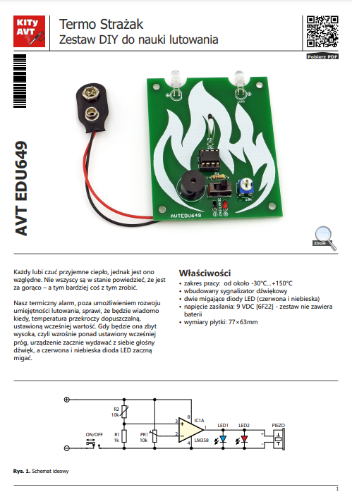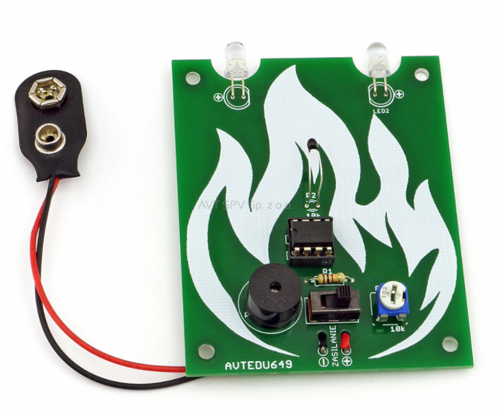 Nasz termiczny alarm, poza umożliwieniem rozwoju umiejętności lutowania, sprawi, że będzie wiadomo kiedy, temperatura przekroczy dopuszczalną, ustawioną wcześniej wartość. Gdy będzie ona zbyt wysoka, czyli wzrośnie ponad ustawiony wcześniej próg, termo-strażak zacznie wydawać z siebie głośny dźwięk, a czerwona i niebieska dioda LED zaczną migać.