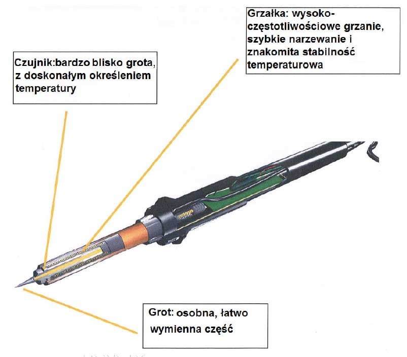 - Nowoczesny układ regulacji temperatury pozwala na precyzyjne ustawienie temperatury grota, niezależnie od jego wielkości i kształtu.