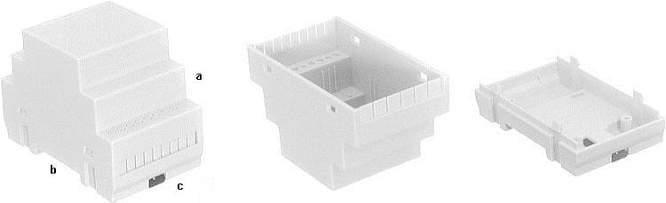 Obudowa z tworzywa, mocowana na szynę. Składa się z dwóch części. Łączenie dolnej i górnej części odbywa się "na zatrzask".