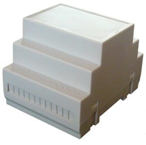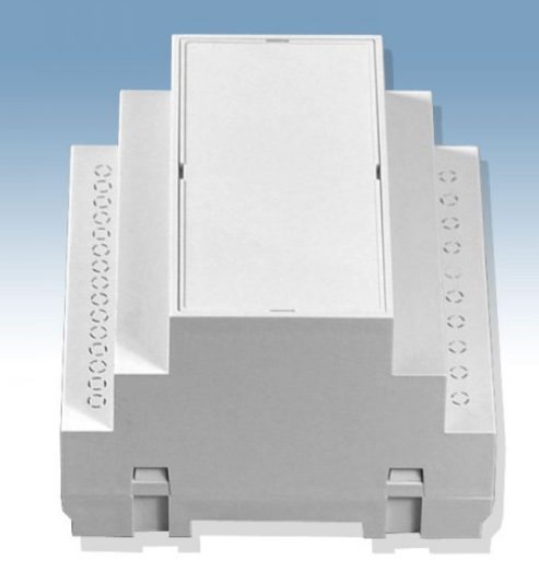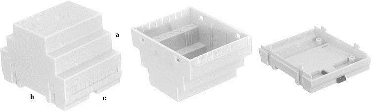 Obudowa z tworzywa, mocowana na szynę. Składa się z dwóch części. Łączenie dolnej i górnej części odbywa się "na zatrzask".