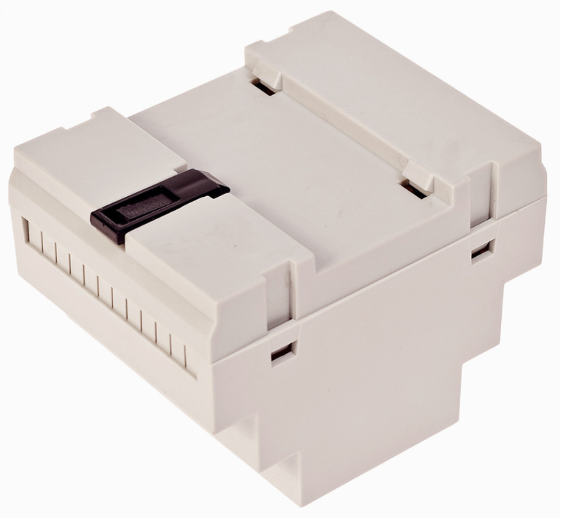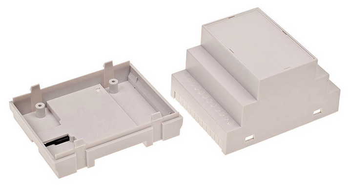 Obudowa z tworzywa, mocowana na szynę. Składa się z dwóch części. Łączenie dolnej i górnej części odbywa się "na zatrzask".