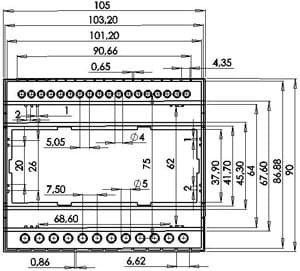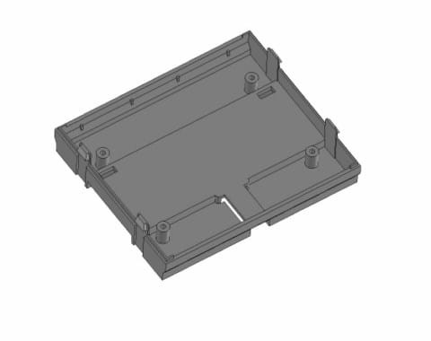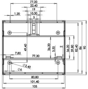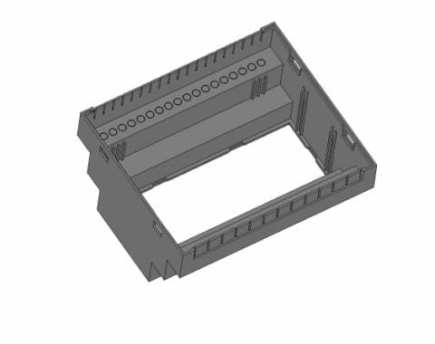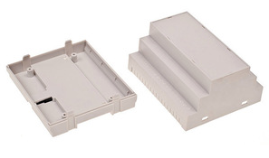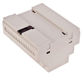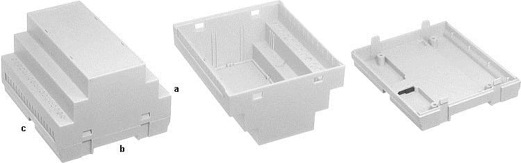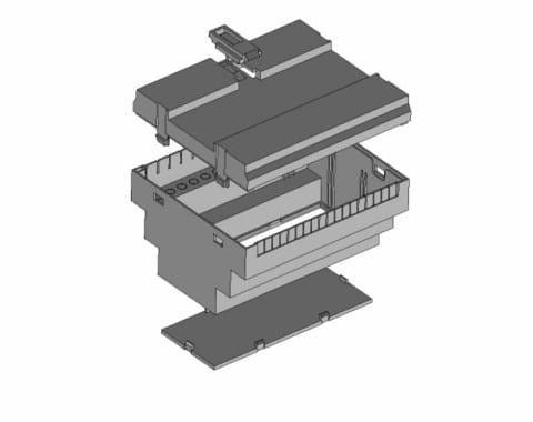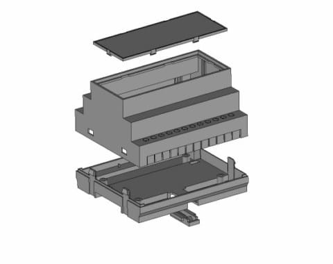 Obudowa z tworzywa - mocowana na szynę. Składa się z dwóch części. Łączenie dolnej i górnej części odbywa się "na zatrzask".