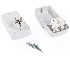Obudowa zasilacza z gniazdem i wtykiem składa się z czterech części. Łączenie dolnej i górnej części odbywa się przy pomocy pięciu wkrętów.
