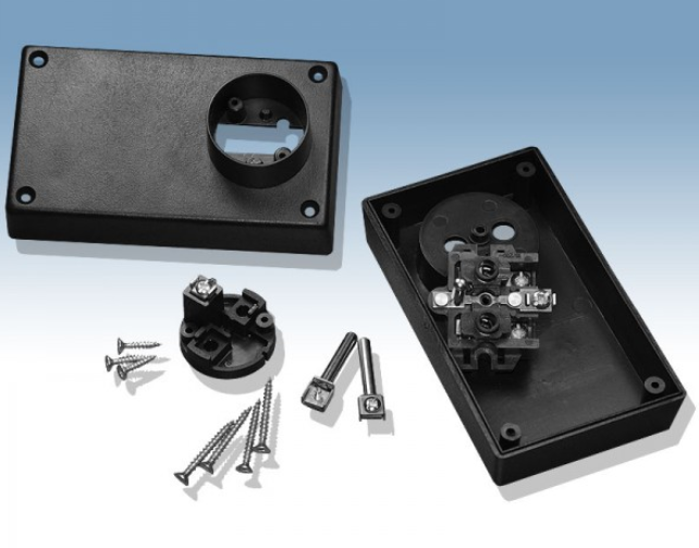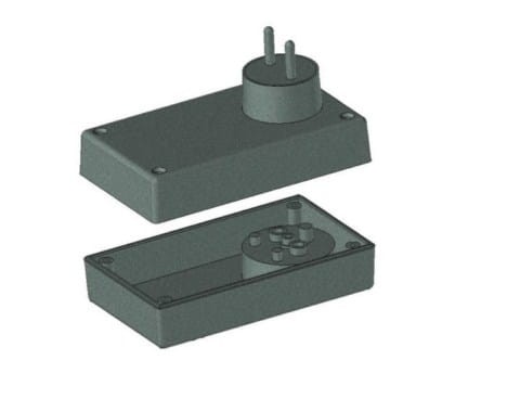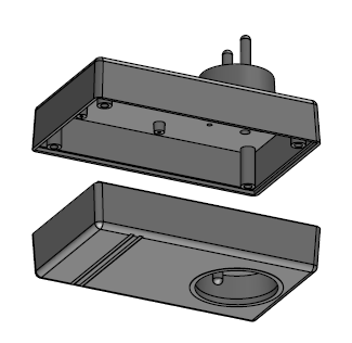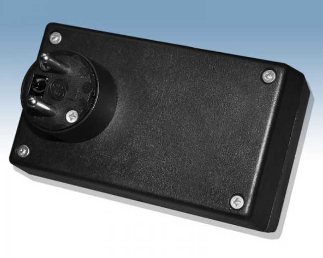 Obudowa zasilacza z gniazdem i wtykiem składa się z czterech części. Łączenie dolnej i górnej części odbywa się przy pomocy czterech wkrętów w narożnikach obudowy.
