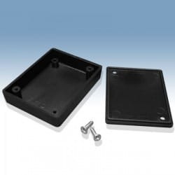 Obudowa z tworzywa uniwersalna pełna . Składa się z dwóch części. Łączenie dolnej i górnej części odbywa się przy pomocy dwóch wkrętów w narożnikach obudowy.Do górnej części obudowy istnieje możliwość przymocowania płytki PCB za pomocą specjalnych kołków.