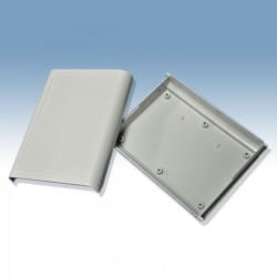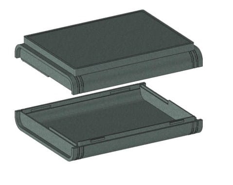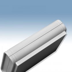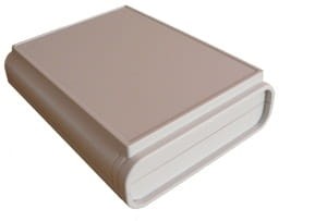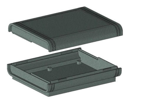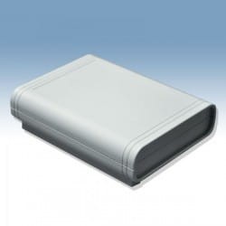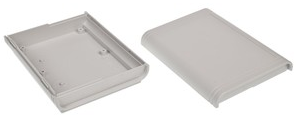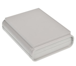 Obudowa z tworzywa uniwersalna pełna. Składa się z dwóch części. Łączenie dolnej i górnej części odbywa się na zatrzask (do zamknięcia obudowy nie są więc wymagane śruby). Obudowa posiada oryginalny kształt i elegancki wygląd. Doskonale sprawdzi się jako rozwiązanie biurkowego urządzenia. Do dolnej części obudowy istnieje możliwość przymocowania płytki PCB za pomocą specjalnych kołków montażowych. Pokrywa obudowy posiada na froncie prostokątne zagłębienie o wymiarach: 74 x 104[mm], które doskonale nadaje się do umieszczenia np. klawiatury membranowej, naklejki lub wyświetlacza. Obudowa nie posiada otworów wentylacyjnych.